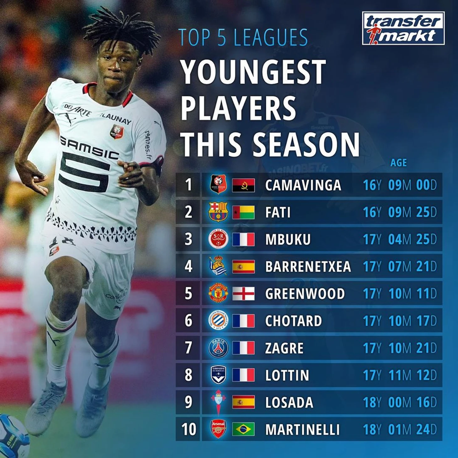Transfermarkt опубликовал самых молодых игроков, которые сыграли уже в этом сезоне в пяти ведущих лигах Европы в этом сезоне. Лига талантов, как всегда, задаёт тон! Половина из этого рейтинга приходится на чемпионат Франции. Самым молодым является полузащитник "Ренна" Эдуардо Камавинга, который недавно зажёг в матче против ПСЖ.
