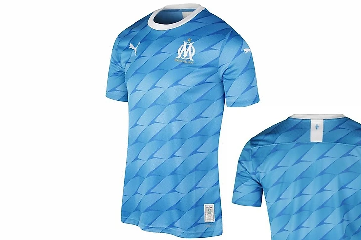 Это красивая голубо-синяя футболка напоминает нам о лучших годах эпохи Бернарда Тапи. Тем более, что рисунок выбран не случайно — он отдает дань уважения архитектуре крыши стадиона «Велодром». Это довольно успешный ход. Обратите внимание также на знаменитый синий крест Марселя на задней части.