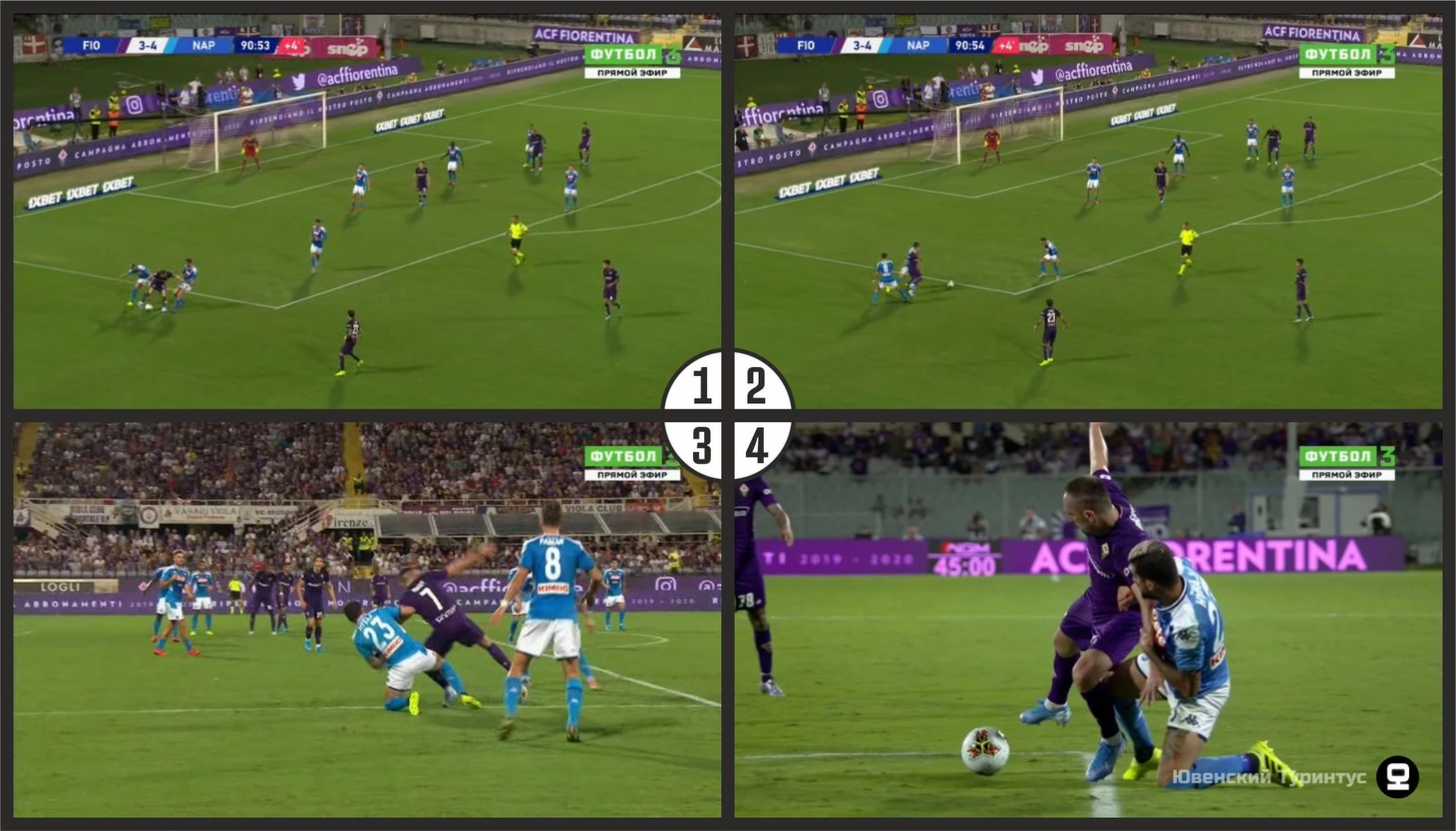 Дальше, 91-ая минута, счёт 3-4 в пользу Наполи. Фиорентина атакует, мяч попадает к Рибери, он пробрасывает мяч через двоих игроков и бежит в штрафную соперника и его откровенно валит Хюсай. Судья находится в 10-ти метрах и внимательно следит за этим моментом.