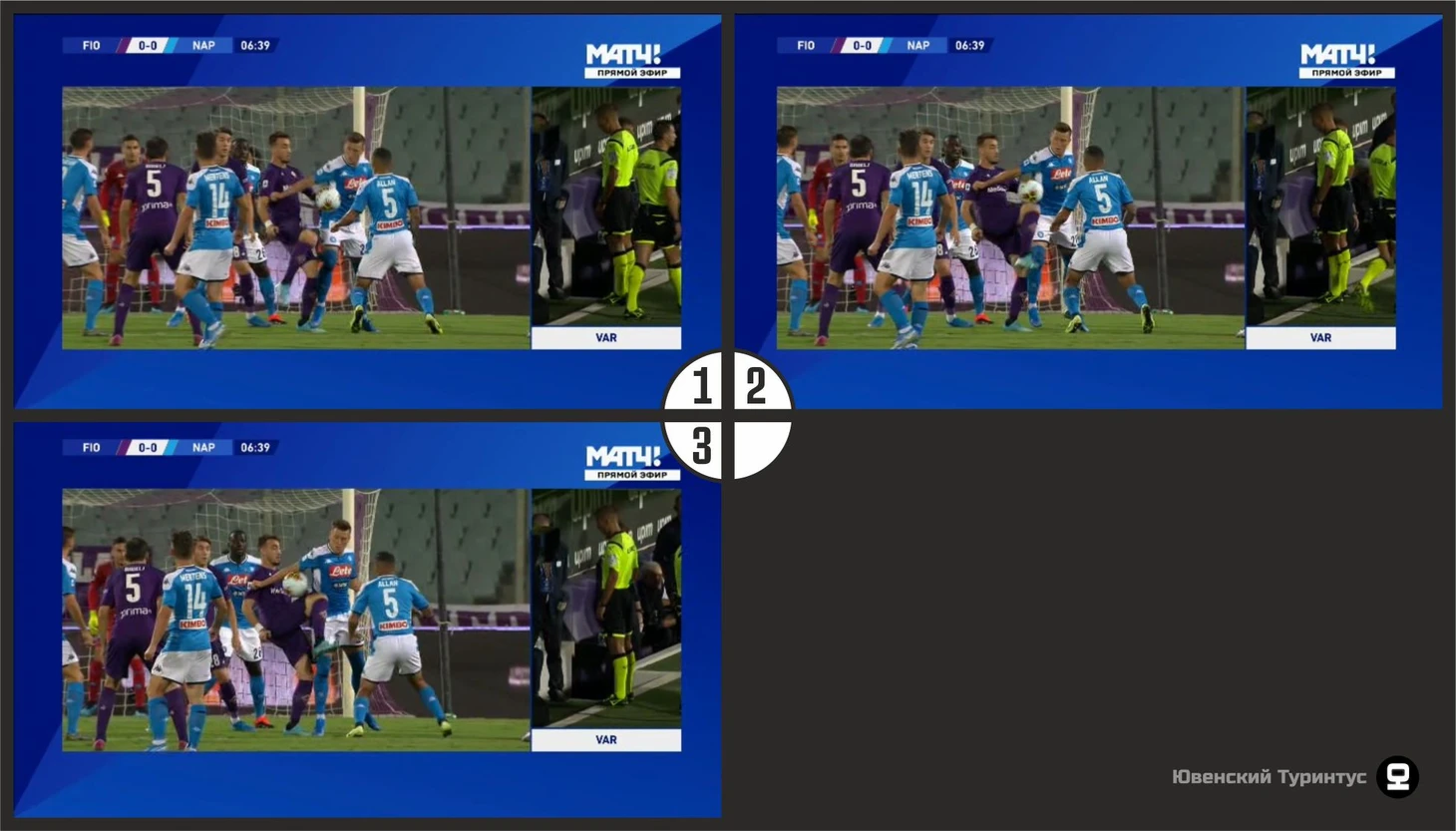 После того, как Хюсай завалил Рибери игра не останавливается, Наполи выбивает мяч подальше, судья убегает от этой точки. Там потом происходит мелкий фол, игроки Фиорентины обступают судью и показывают ему: там нарушение было, ты слепой?