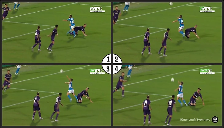 А тут игрок Фиорентины бьёт коленом в руку Зелинского, какой это пенальти? Может, мне кто-то объяснит это? Я не понимаю.