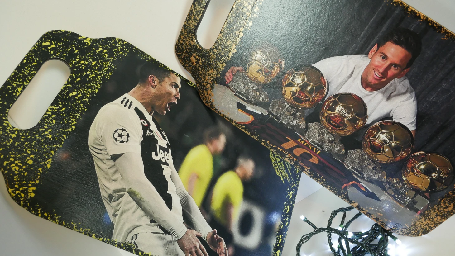 А, не, знаю, давайте так. Если прям точный счёт угадаете, я вышлю вам вот такую вот разделочную доску, которая сделана по технологии декупаж с Криштиану Роналду, Лионелем Месси или с любым другим футболистом, которого вы сам выберете!