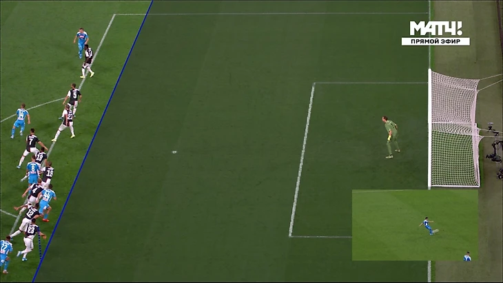 Либо, вот, всё хорошо. Атака, буквально в два касания со своей половины поля. Сандро - длинный пас на Матюиди, тот в одно касание на Роналду и удар, с которым Мерет справляется лишь отбивая мяч двумя руками.
