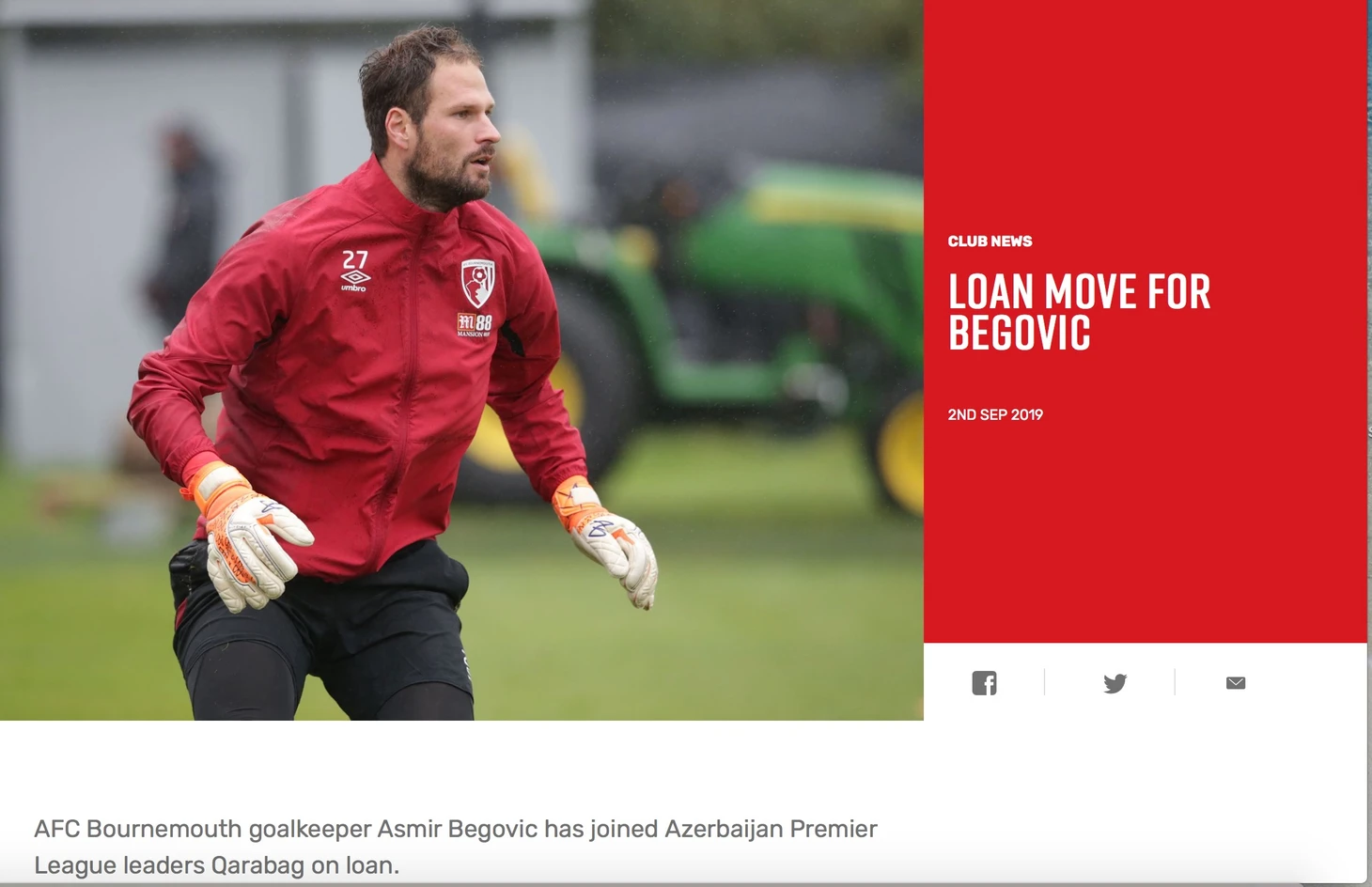 32-летний кипер, проведший почти всю карьеру в Англии, переходит в агдамский клуб на правах аренды.Бегович провел последние 2 года в качестве игрока основного состава "Борнмута" в АПЛ. Он также известен по выступлениям за "Сток Сити" (2010/15) и "Челси", где отыграл 19 матчей в Премьер-лиге. В активе Беговича также 65 матчей за сборную Боснии и Герцеговины."Карабах" арендовал именитого вратаря сроком на 4 месяца.