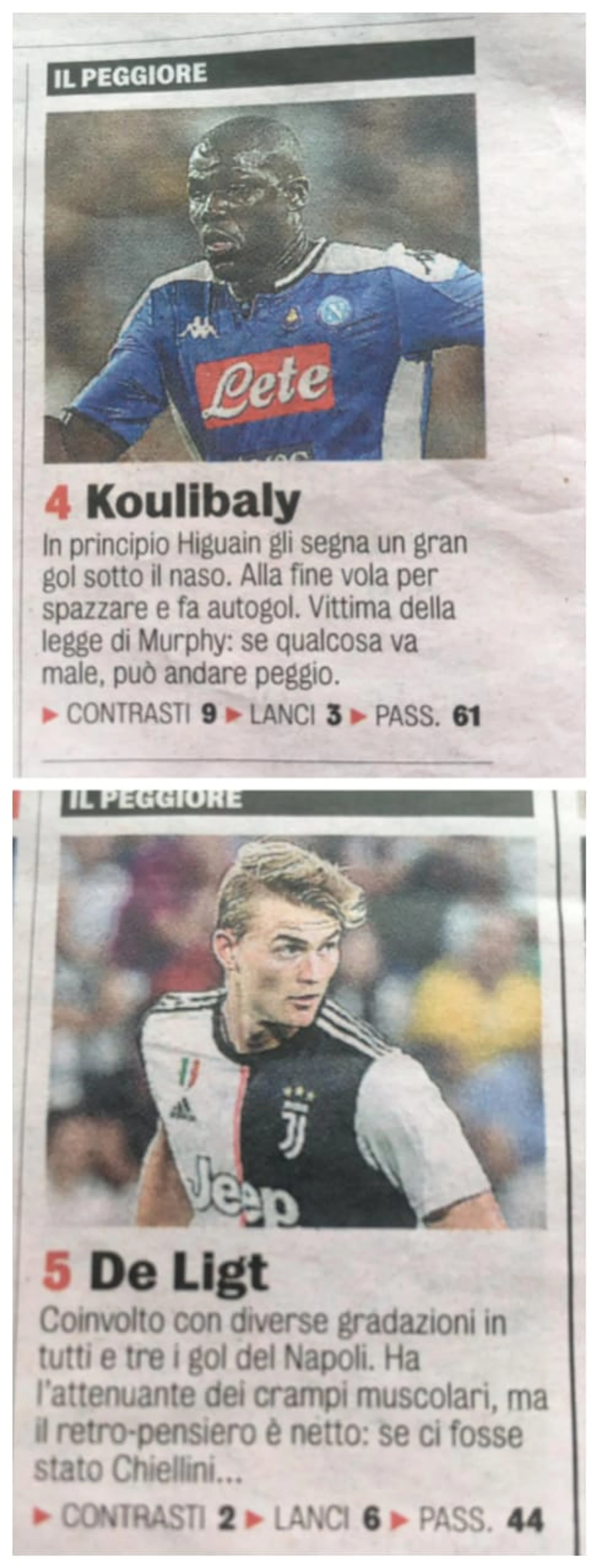 «Де Лигт (худший в «Ювентусе», оценка 5). Причастен в разной степени ко всем трём голам Наполи. Испытывал мышечные боли, но ретро-мышление налицо... если бы был Кьеллини...»