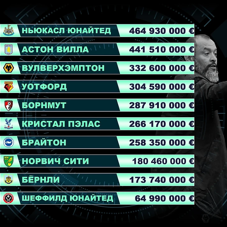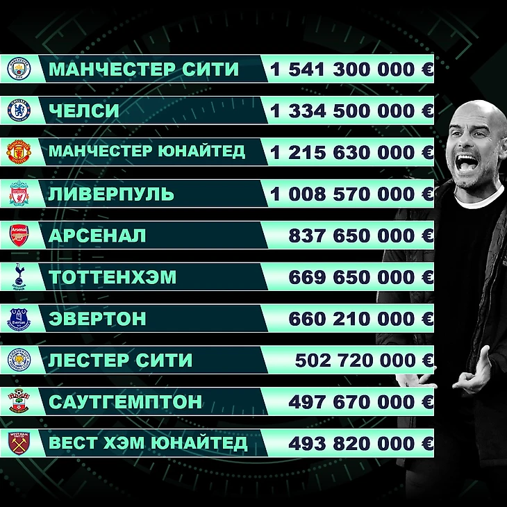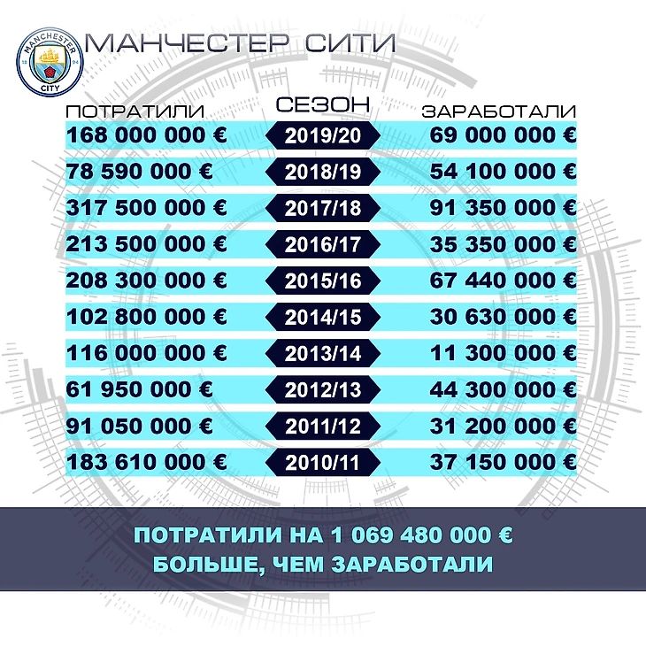 В общей сложности команды, играющие в нынешнем розыгрыше АПЛ за 10 лет потратили на трансферы более 11 млрд евро. Не сложно догадаться, кто отдал денег за новых футболистов больше остальных. Да, это «Манчестер Сити». «Горожане» за этот период потратили на новых игроков больше, чем «Шеффилд Юнайтед», «Бёрнли», «Норвич Сити», «Брайтон», «Кристал Пэлас», «Борнмут» и «Уотфорд» вместе взятые.