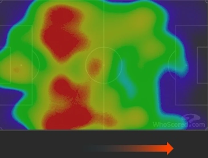 Весь первый тайм Челси владел мячом, но не территорией. Для 64% владения в первом тайме и 62% в целом за матч хозяева чудовищно мало времени проводили на половине поля соперника. Всего 25% времени(у Шеффилда 28%) было на половине поля гостей, это говорит нам о слабой структуре продвижения мяча. Если мы посмотрим на тепловую карту «синих» то всё станет ещё наглядней.