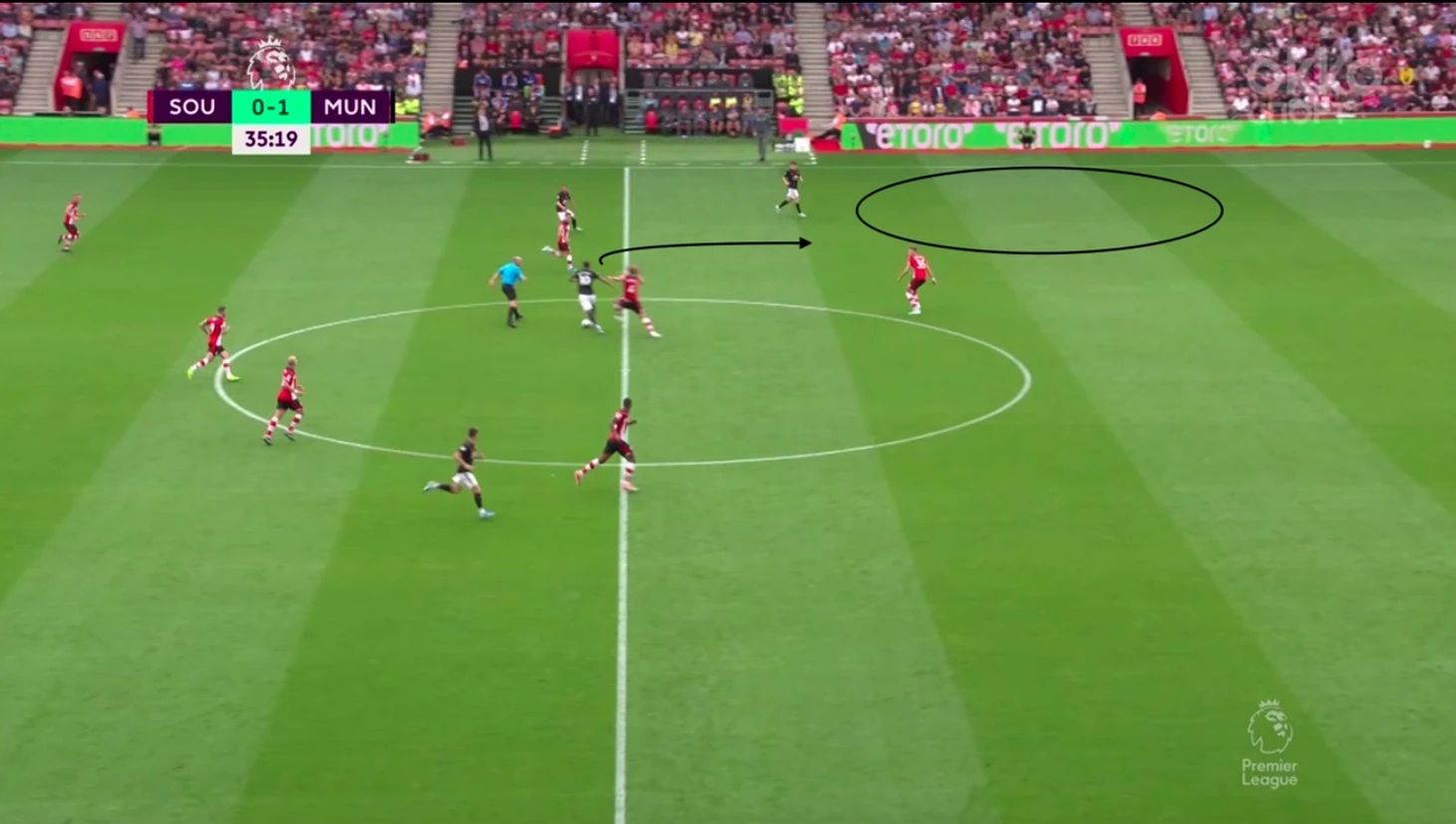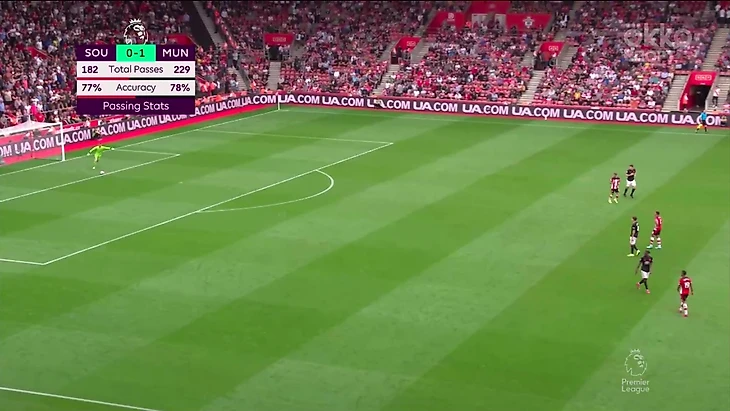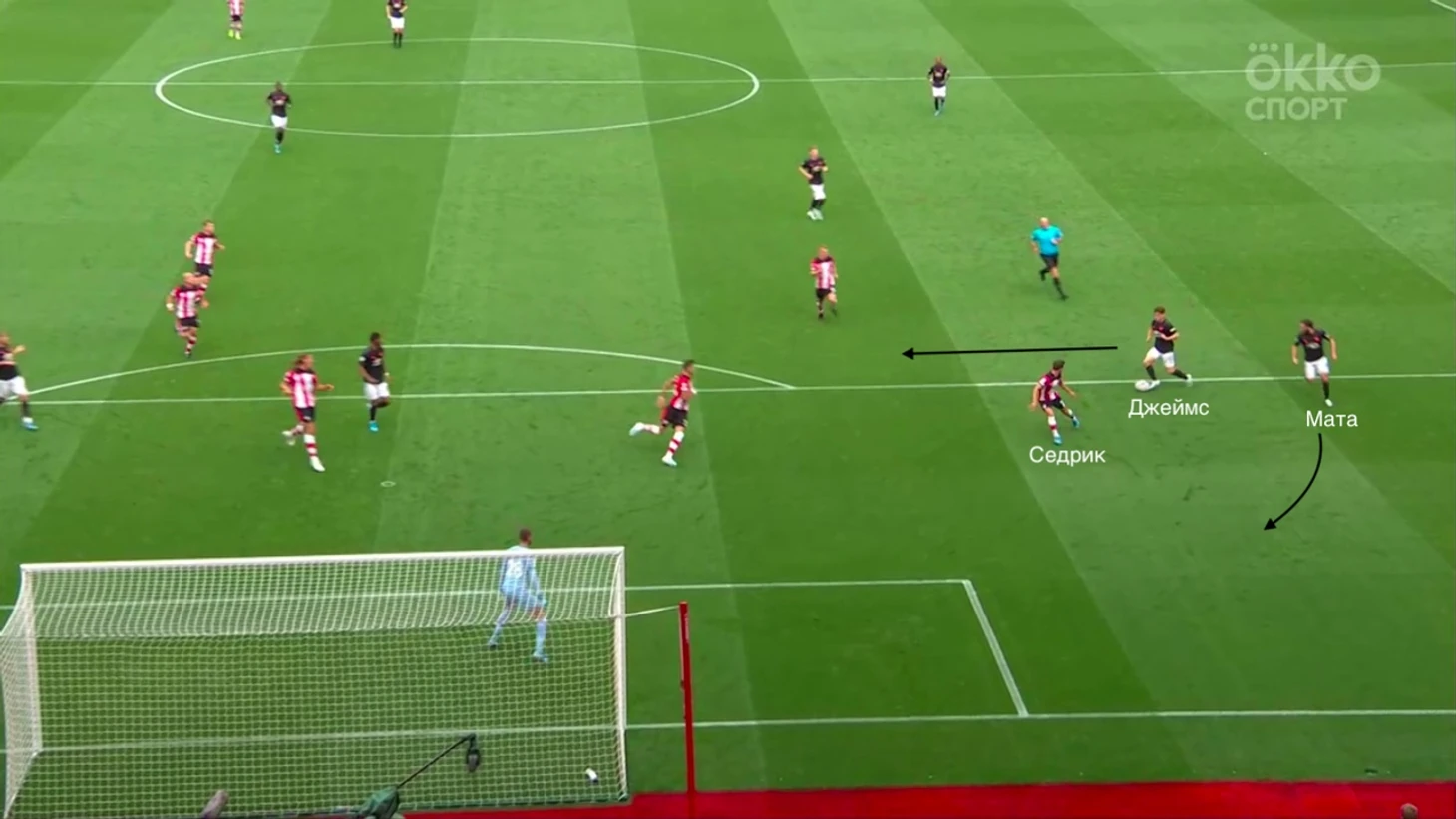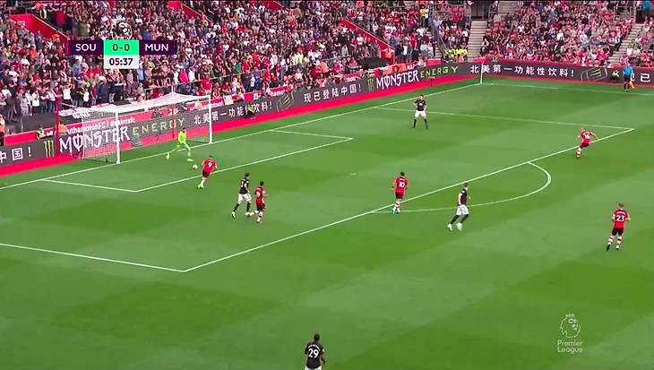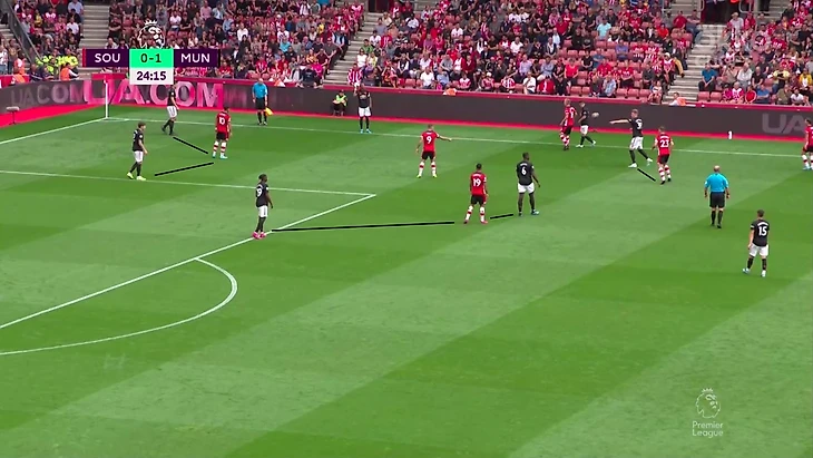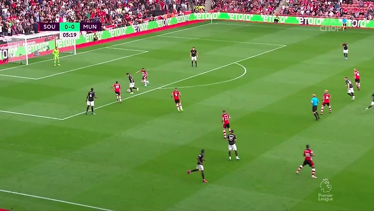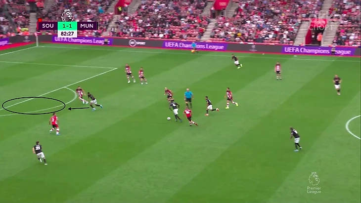Гол был забит после грамотного выхода из под давления и в итоге команда хозяев была разбита на пополам—одна часть из них оказывала давление, вторая уже оборонялась в низком блоке. Разрывы между линиями очень часто случались у Саутгемптона. При этом стоит отметить очень умное движение Маты, который создал в зоне Седрика ситуацию 2 в 1, при которой тот разрывался: Джеймс вполне мог сыграть на испанца в ширину и поэтому Седрик пятился назад. Он хотел иметь возможность накрыть прострел Маты.За первый тайм мы увидели очень крутой прессинг хозяев, который иногда разбавлялся контратаками Юнайтед. Всё же нужно поработать над поддержкой давления остальной команды. Иногда ошибался и Вестергор, который играл персонально против Решфорда(два удара за тайм, оба из штрафной).