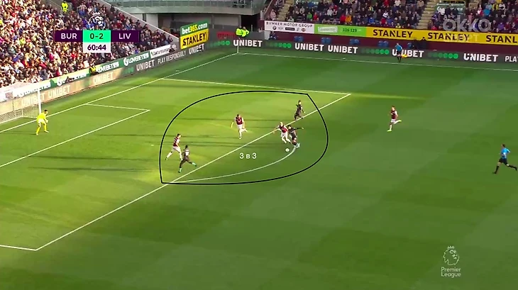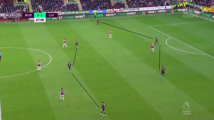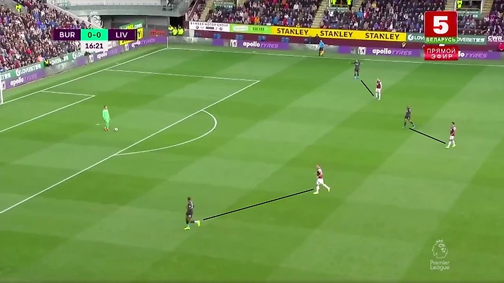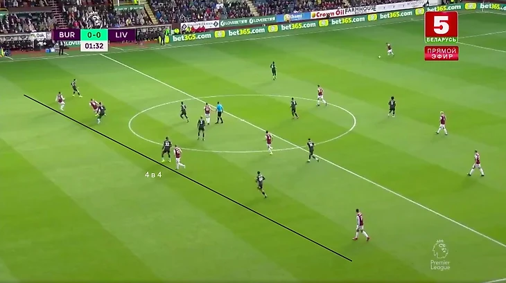 Бёрнли тоже иногда прессинговал, затрудняя продвижение мяча для «мерсисайдцев». При 4-4-2 у хозяев было равенство в первом этапе—2 в 2.