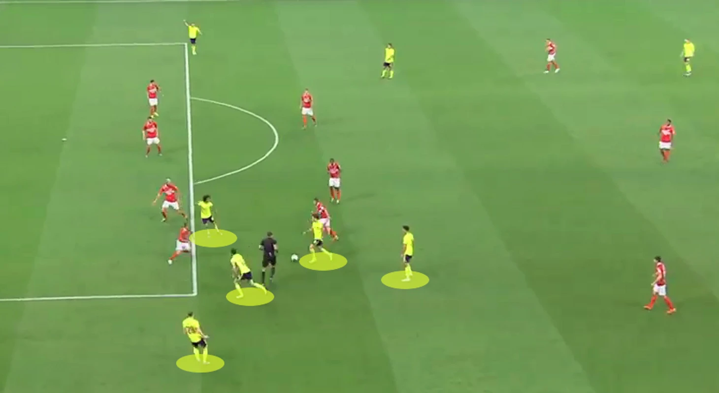 Перегруз на фланге - очень частый ход для ростовской команды. Насыщая одну из зон в атаке, Ростов часто создаёт численное преимущество, если структура игры соперника не является достаточно гибкой. В этом случае защищающихся игроков банально меньше, чем атакующих и остаётся только довести мяч до партнёра, который остался свободен от опекуна.