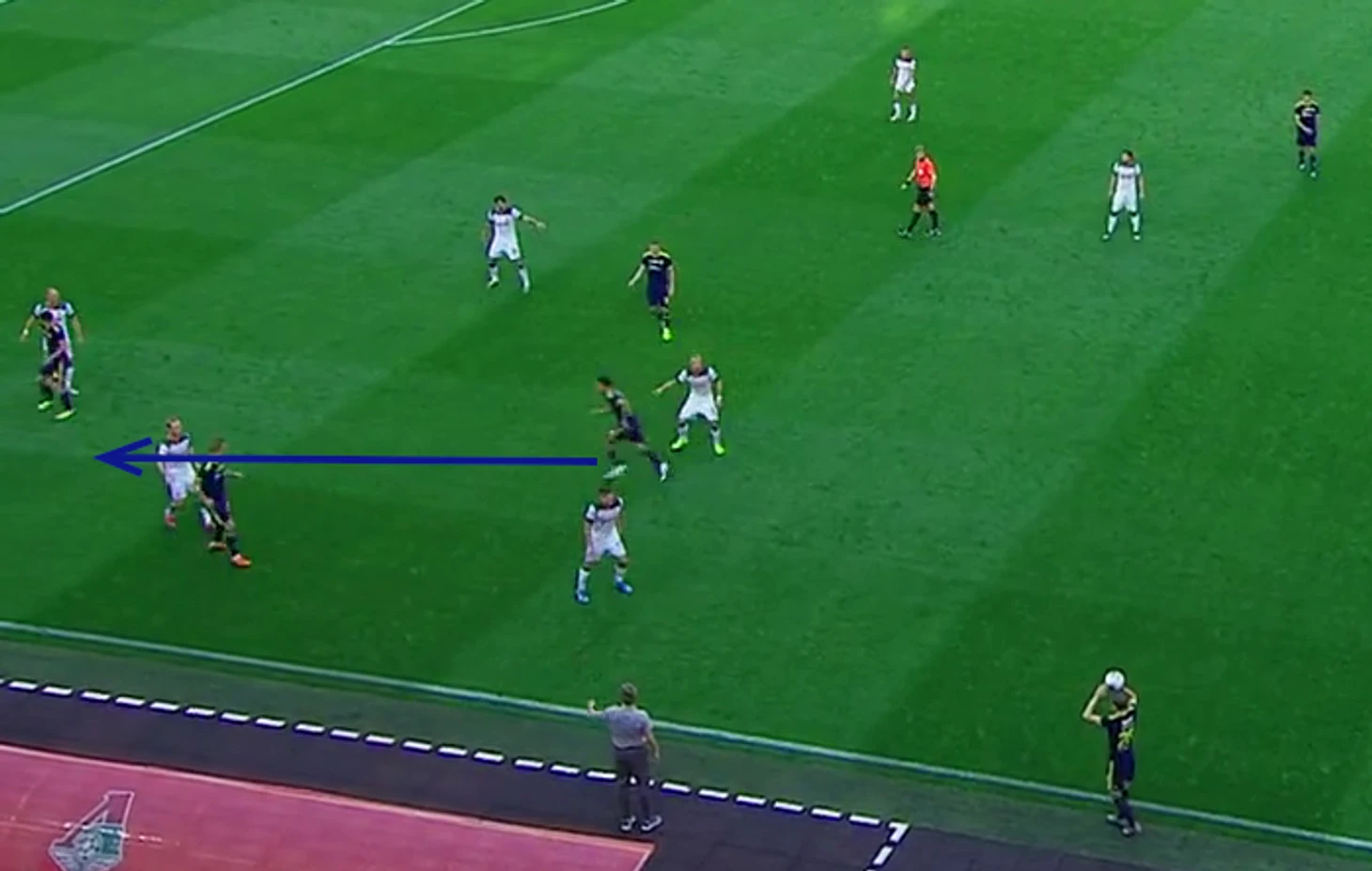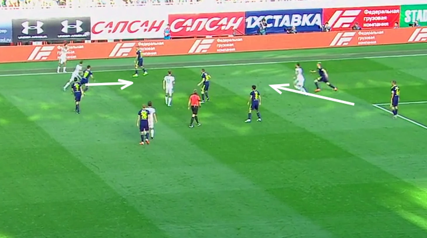 Понятно, что насыщая игроками одну зону, команда оставляет остальные участки поля под меньшим контролем. Там могут открываться атакующие игроки соперника, получать мяч и делать свои нехорошие дела. Здесь главным становится вопрос о том, как довести мяч в эти свободные зоны для атакующей команды, а для Ростова - как перекрыть кислород игроку с мячом настолько, чтобы он не мог поднять головы и выполнить перевод.