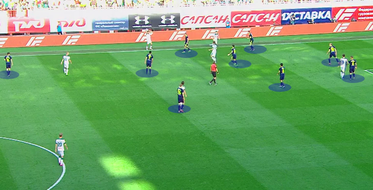 Вообще, плотность в районе мяча при обороне - вещь достаточно общепринятая. Но если говорить о стиле игры Ростова, то здесь это является основой обороны - большая часть команды скапливается в районе обитания мяча, отдавая лишь минимальное внимание остальным зонам.
