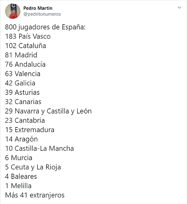 Что же касается общего количества баскских игроков в составе сборной Испании... Здесь есть разночтения. И касаются они общего числа пиренейских футболистов. Педро Мартин называет 800 игроков сборной, 183 из которых являются басками (Нуньес 184-й), тогда как сайт eu-football.info приводит имена лишь 796 футболистов. Благо, никто не спорит с тем, что на протяжении всей истории именно баски вкупе с каталонцами являлись основной движущей силой Красной Фурии.