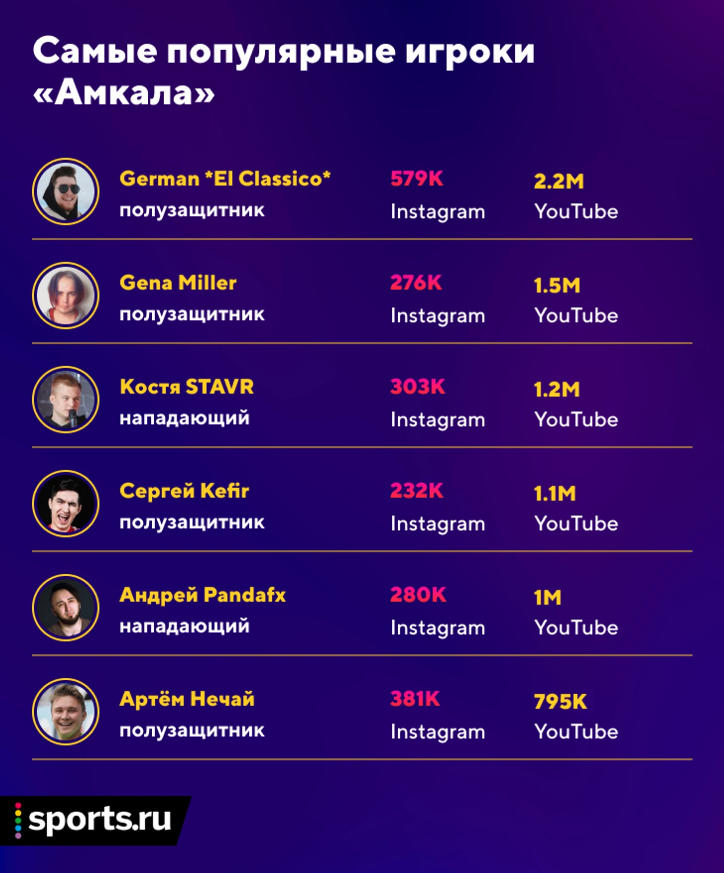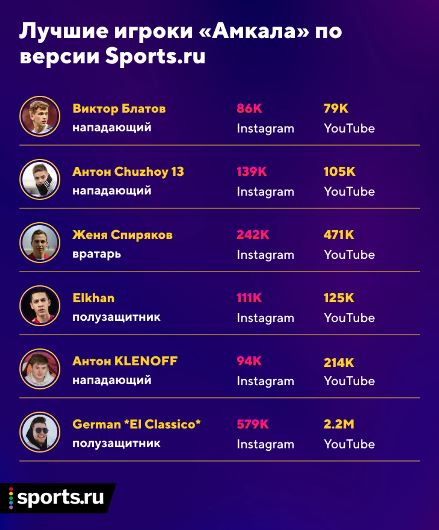 За полгода аудитория непрофессионального игрока Виктора Блатова в инстаграме выросла от нескольких тысяч до 86-и, а на новом канале в ютубе у него 79 тысяч подписчиков. Фристайлер и тренер Антон Карпов под ником Chuzhoy 13 ходил с 15 тысячами в инстаграме, сейчас – 139 тысяч. У фристайлера Elkhan, развлекающего болельщиков игрой в панну перед матчами на «ВЭБ-Арене», 125 тысяч подписчиков на канале, которого не было еще полгода назад. У вратаря «Амкала» и креативного директора Sports.ru Федора Маслова вообще взрыв: почти с нуля набрал 135 тысяч в инстаграме.