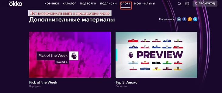 Есть существенный недостаток при использовании подписки спорт в браузере на компьютере. На сайте «Окко» в разделе спорт очень неудобная навигация. Если ты в разделе «спорт» и проходишь дальше на несколько уровней в подразделы (Пример: спорт => 3 тур => дополнительные материалы), то из раздела доп. материалы в 3 тур, ты уже вернуться не можешь, так как нет стрелки. И приходится нажимать снова на кнопку «спорт» и идти в начало меню, ну или использовать кнопку “назад” в браузере. Но все‑таки интуитивно ты ищешь возможность вернуться в предыдущее меню на сайте, и это удобнее.