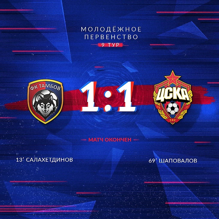 14 сентября 2019, 14:25 1 мин. Матч молодежных команд Тамбов - ЦСКА завершился вничьюААГАвтор524 подписатьсяЦСКА мол