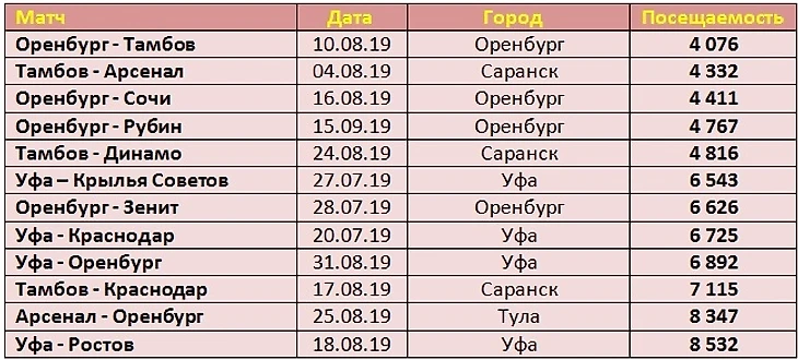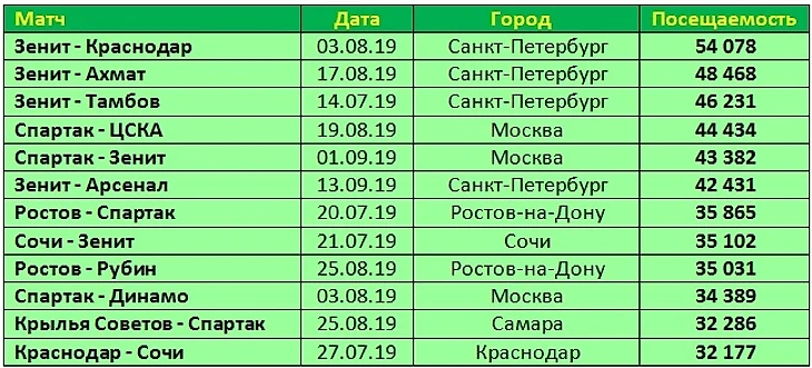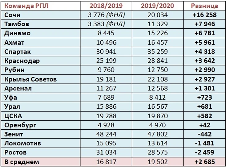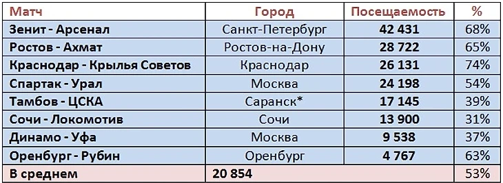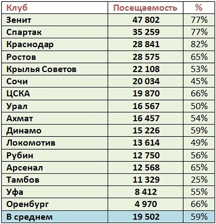 Средняя домашняя посещаемость клубов РПЛ, после 9 тура: