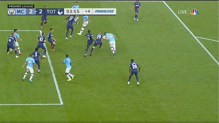 На 92’ минуте матча Габриель Жезус забивает гол после розыгрыша углового. За пару мгновений до этого борьбу за верховой мяч вели Скипп и Лапорт. Последнего мяч прочесал по руке. Сначала гол засчитывается. Майкл Оливер обсуждает эпизод с коллегами из кабинета VAR и через несколько минут гол отменяют.
