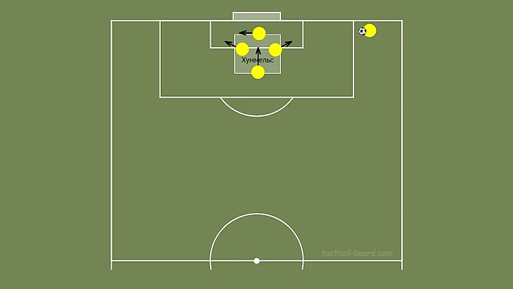 Матс — уже ключевой игрок в системе игры Фавра. Во-первых, его первый пас используется на 100%. Во-вторых, он становится главным оружием при стандартах. Фавр придумал очень простой и классный розыгрыш. При таком штрафном 3 игрока «Боруссии» разбегаются на ближнюю и дальнюю штангу, освобождая пространство для Хуммельса. Пока минусом можно считать то, что в центральной зоне остается только Матс и перехватить передачу для соперника проще, так как он не отвлекается на соперника.