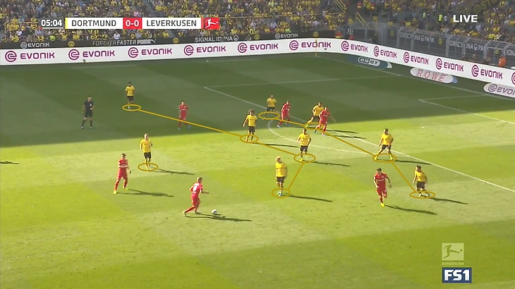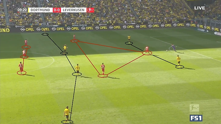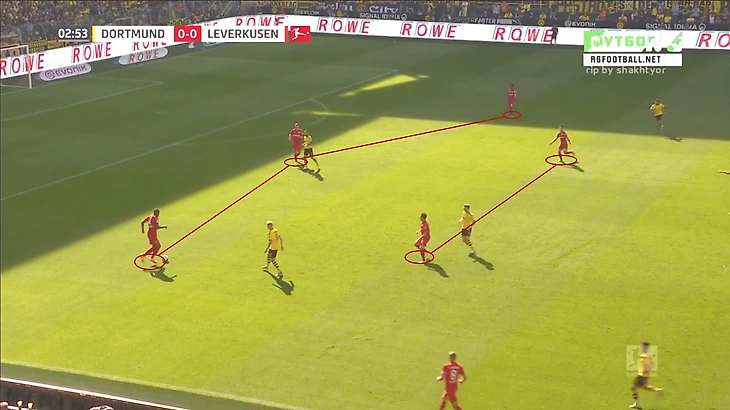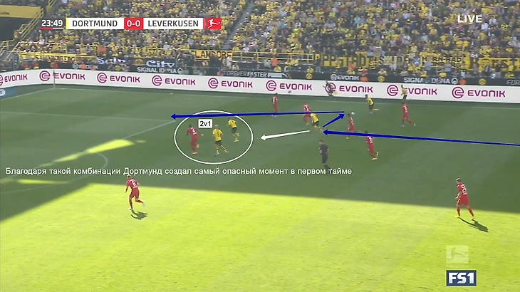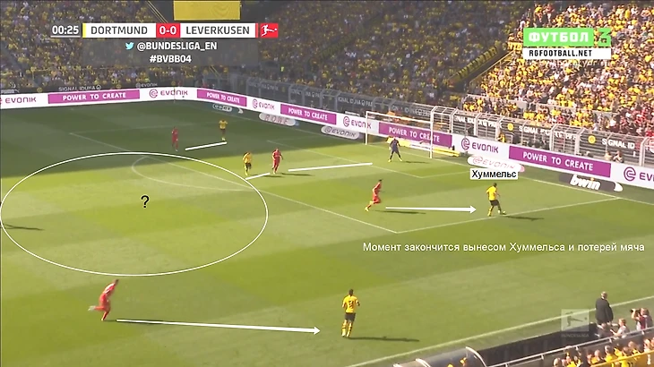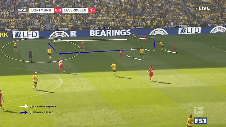 Таким приемом «Боруссия» должна была отрезать минимум 5 игроков «Байера», которые участвуют в активном прессинге. Но в этом моменте игроки «Байера» перехватили передачу Ройса на Ашрафа.