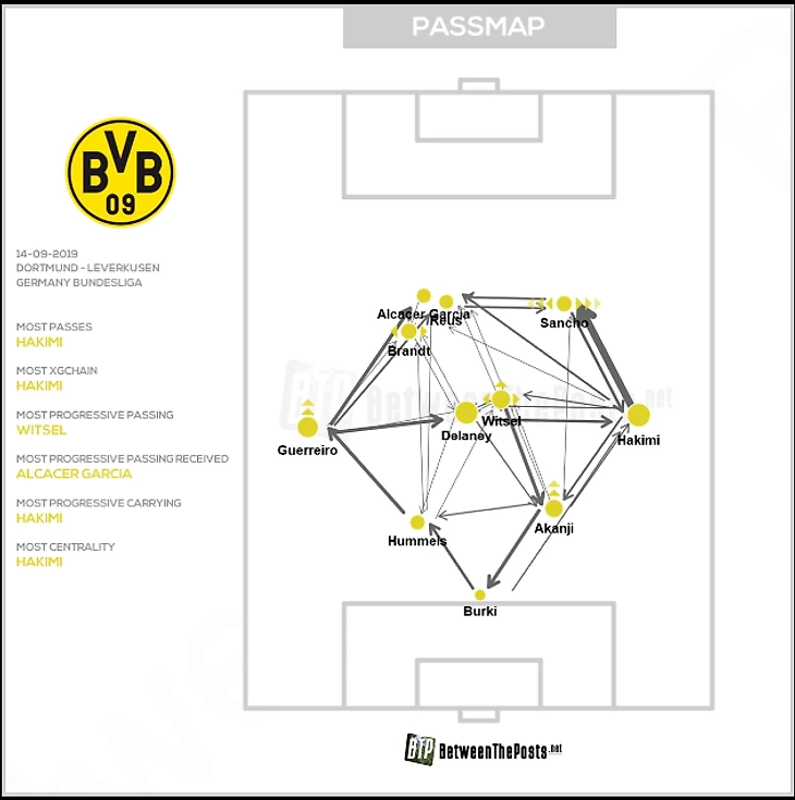 Крайние полузащитники в команде очень высокого уровня, но у них очень разные функции. Санчо более похож на классического крайка, редко смещается в центр. В основном он располагался на фланге и отвлекал внимание Венделла, что было крайне важно, так как это давало больше пространства для Ашрафа, который в результате сделал голевую передачу. Брандт, в свою очередь, смещался в центр, что безусловно поднимало уровень креатива в крови «шмелей». Также такое узкое расположение Юлиана освобождало пространство для Геррейру. Дилэйни и Витсель часто находились близко друг к другу. Я думаю, что это из-за недостаточного уровня паса у Томаса. Как только датчанин отбирал или делал перехват, он просто пасовал ближайшему партнеру, преимущественно это был Витсель. Вторым и третьим вариантами продолжение атаки были пас назад и заброс за спину на Алькасера.