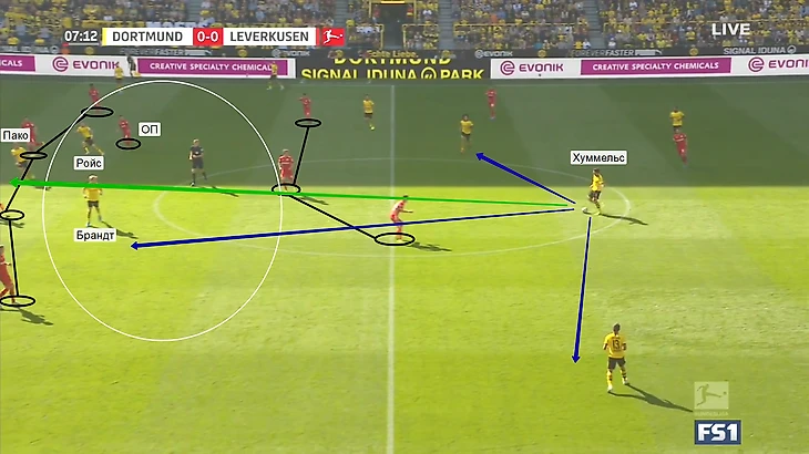 В этом эпизоде очень классно игроки «Боруссии» заняли позиции в атаке. Сначала нужно отметить, сколько пространства появилось между линиями обороны и полузащиты «Байера». Соперники очень здорово этим воспользовались. Опорник «Байера» должен был перекрыть и страховать эту зону, но Ройс круто увел его правее, что дает возможность Хуммельсу отдать мяч и Брандту, и Пако. Сам испанец в это время отвлекает двух ЦЗ, а Брандт из-за того, что один из опорников «Байера» был слишком высоко, остается сам.