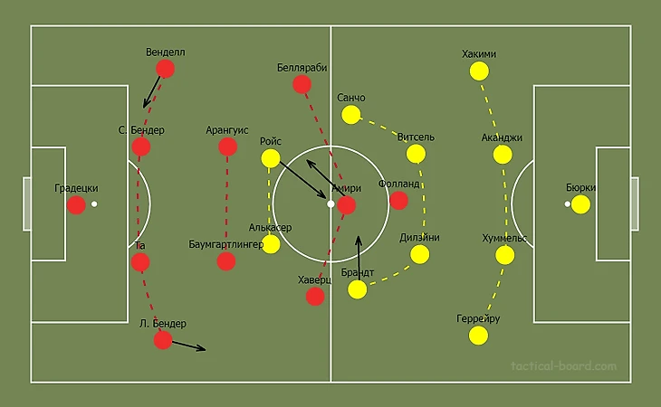 Бэйли при атаках занимал место Белльяраби на левой бровке, а Карим перешел на правый фланг. При прессинге Леон занимал место левого центрального полузащитника, что ослабило центр поля и контратаки дортмундцев стали еще опаснее.