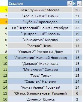 Идем дальше, и теперь уже окончательно переходим к разговору о стадионах. Первая таблица "загруженность арен" - сколько матчей топ-уровня сыграно на каждом из наших стадионов.