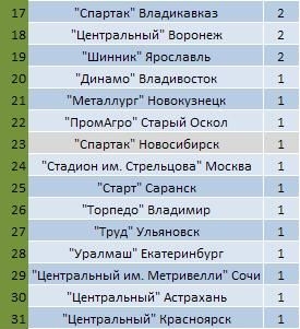 О "лидере" нашего грустного рейтинга не будем много рассуждать, там-то точно стечение всех возможных факторов: погоды, времени начала матча, популярности "Рубина" и прочее, и прочее, сыграло свою роль. А в целом лидером, по "вялости" болельщиков становится Нальчик, ему принадлежат 3 места в таблице. Отметился поначалу сезона и ФК "Краснодар", а в концовке "подтянулись" ЦСКА и "Волга". Так в итоге табличка и сложилась.