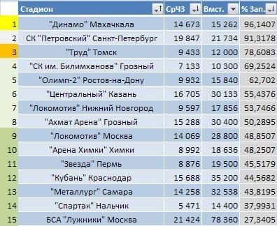 Последняя таблица, и, в целом, так же довольно пессимистичная. В ней основной показатель - процент заполняемости арен.