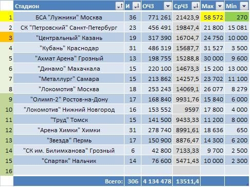 Идем дальше, и нас прямо по курсу посещаемость на наших стадионах. Для чистоты эксперимента, и дабы устранить случайности, в эту таблицы включены только те арены, на которых сыграно 3 и более встреч. Остальные учтены в общем подсчете числа матчей и средней посещаемости, но выведены за рамки таблицы.