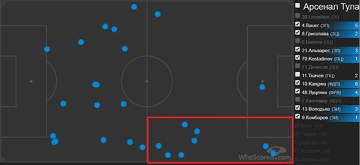 Стоит отдельно отметить очевидный прогресс Кузяева, который за прошедшие пару недель явно набрал форму и на правом краю атаки смотрелся очень органично. Далер создал отличный момент для Азмуна, едва не забил сам и отдал ключевую вразрез в атаке с пенальти. Плюс к тому на фланге Кузяева-Смольникова у Зенита получалось эффективно прессинговать: 8 из 10 потерь на своей половине поля туляки совершили именно в этой зоне.