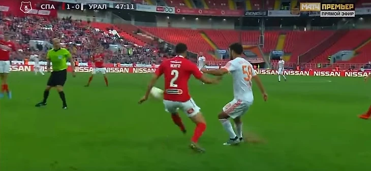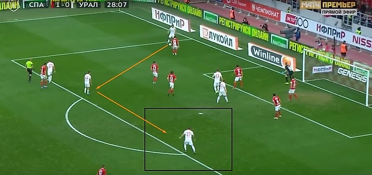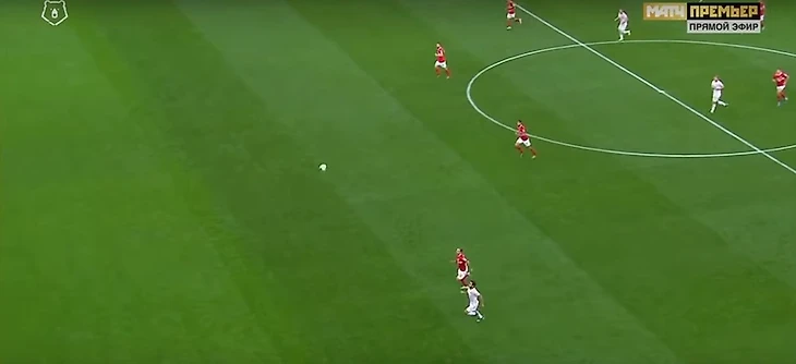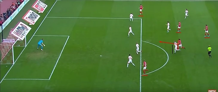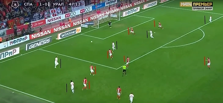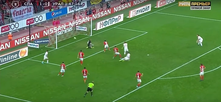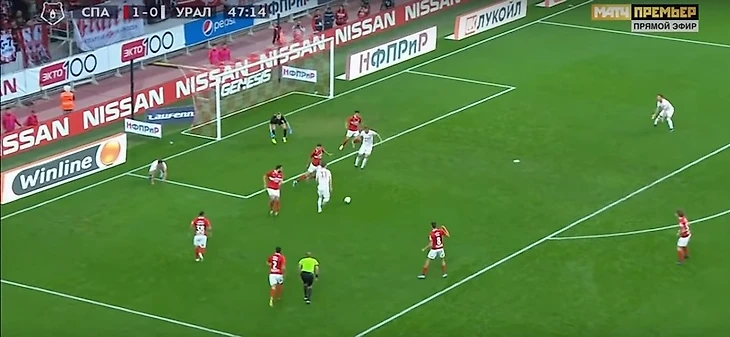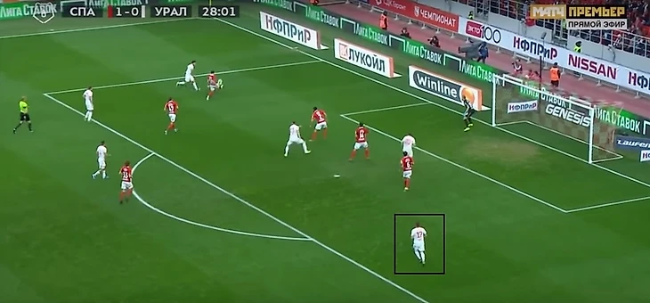 Давайте разберем ситуацию с первым голом. Она чудо как хороша) Обратите внимания на действия или их отсутствие у Ещенко.Начинаем с фланга, где Жиго страхуя Ещенко(справа на скрине) борется с Ильиным, Ильин не может ничего поделать, но сохраняет мяч скатывая его Эль Кабиру и !!! внимание, начинает подключаться, то чего нет у нас. Заметьте, я до игры писал, что Урал играет флангами, создать перегруз на фланге сместив туда нападающего на помощь крайнему полузащитнику — это задача минимального уровня сложности, почему мы не готовы не ясно. В момент приема мяча Эль Кабиром, Ещенко обменялся позициями с Жиго расположив себя ближе к воротам. Жиго пытается накрыть навес, не успевает. На следующем скриншоте я обозначил игроков команд, из которого видно численное превосходство Спартака, также видно, что за Ильиным(самый левый) должен присматривать Ещенко. В следующий момент игрок Урала пяткой в одно касание пытается скинуть мяч в центр, пас перехвачен и отскакивает на свободное пространство, где его подхватывает Ильин, смещается в центр и бьёт. Ещенко в момент подбора мяча Ильиным замедляется, хотя казалось куда еще, если ты итак не участвовал в эпизоде. На последнем скриншоте с другого ракурса видно как Ещенко упускает рывок Ильина и вместо следования за ним делает шаг выстраиваясь в линию с Жиго, Ещенко никогда не был силён в выборе позиции-это правда. Также посмотрите как игроки Урала создают и используют свободные зоны. Они не встают в одну линию с защитой соперника, а вбегают на скорости, получают мяч и обыгрываются с уже набегающими партнерами.