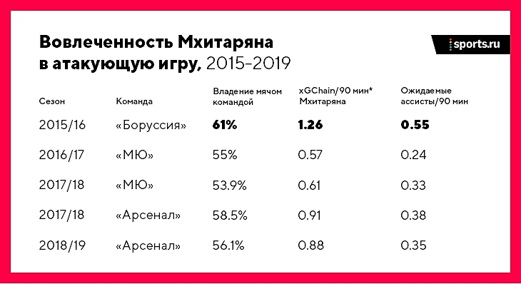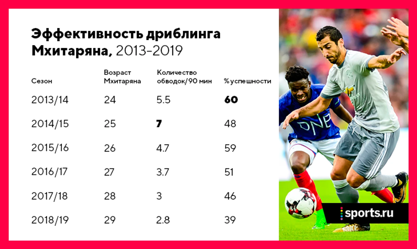 Помимо этого, Мхитарян был реально не очень нужен клубу и самому Эмери. «Арсенал» полагался на вингеров, поэтому клубу нужен был игрок, который хорошо и успешно шел бы в дриблинг. Учитывая, что с возрастом количество и качество дриблинга обычно падает, Мхитарян слабо подходил на эту роль. Хуже всего то, что падение его цифр почти полностью совпадало с тем, что предполагала модель Колина Трейнора: