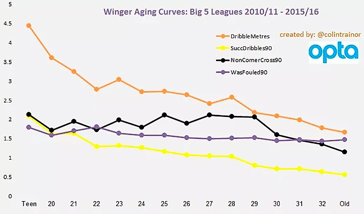 Хуже всего то, что и сам Мики тоже начинал сдавать. Если в «МЮ» еще были подозрения, что проблемы Мхитаряна сугубо стилистические, то в «Арсенале» стал виден спад. Колин Трейнор из Statsbomb в 2016 году сделал большое исследование про вингеров и их угасание: так, пик крайних нападающих обычно приходится на период в 26-28 лет.