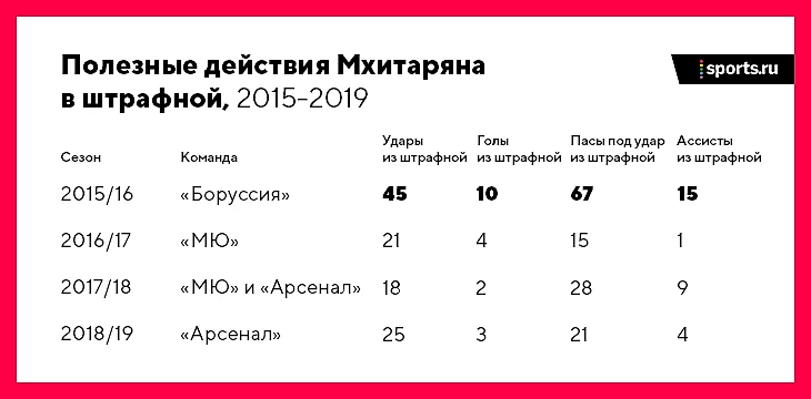 Количество действий Мхитаряна внутри штрафной в каждом из последних сезонов показывает, что он стал играть сильно ниже, чем должен: