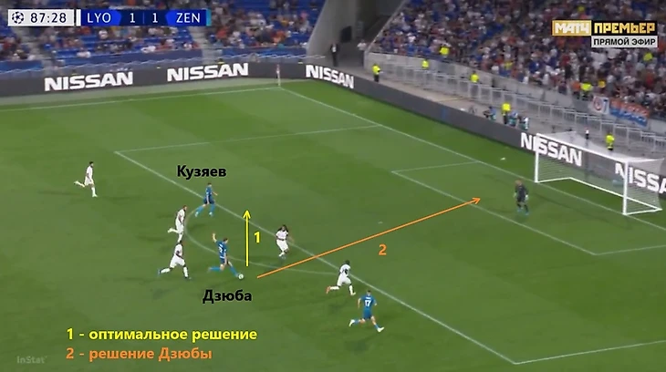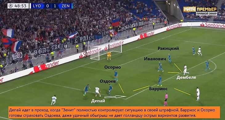 У хозяев было умеренное преимущество по владению (58% против 42%), но при этом контроль был довольно стерильным с редкими попытками обостряющих передач и ставкой на индивидуальный обыгрыш. Депай и Рен-Аделаид были достаточно эффективны в дриблинге (12 из 16 удачных попыток на двоих), но втащить мяч в штрафную «Зенита» у лионцев за весь матч получилось лишь трижды – подстраховка у гостей работала на очень приличном уровне.