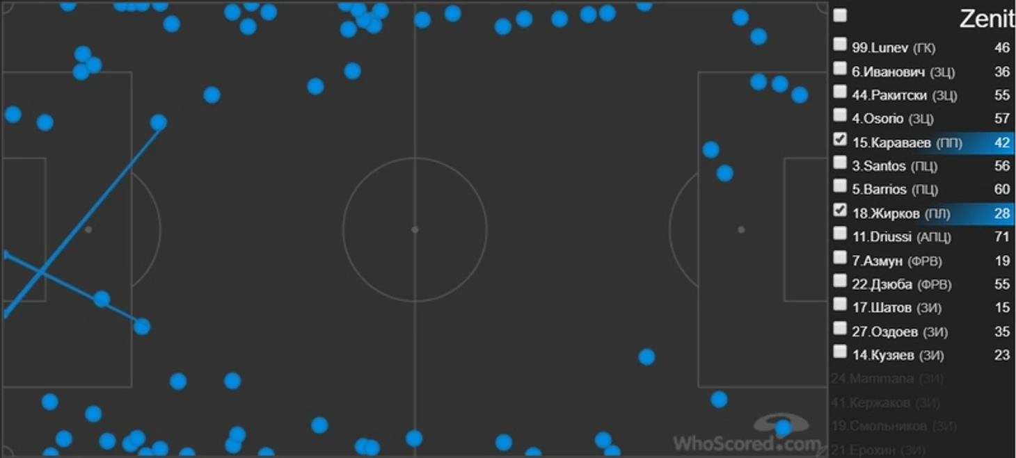 Жирков слева и дебютировавший в старте Караваев справа имели возможность для более высоких включений в атаку, и практиковали их достаточно регулярно. Несмотря на то, что «Зенит» все-таки играл «вторым номером», фулбэки гостей гораздо чаще встречались с мячом именно на чужой половине поля (47 касаний против 23) – очевидный признак того, что план Семака не был сугубо сдерживающим и контратакующим.