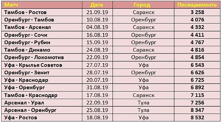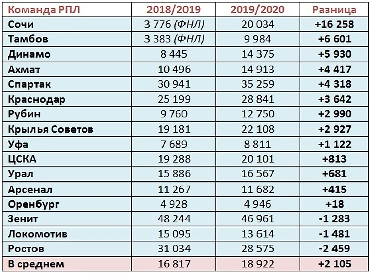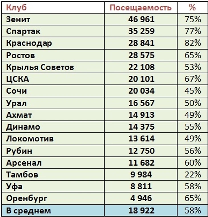 Средняя домашняя посещаемость клубов РПЛ, после 10 тура: