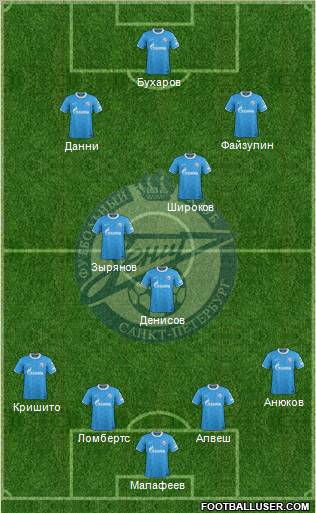 «Зенит» (версия ProZenit Open Blog): Малафеев – Анюков, Алвеш, Ломбертс, Кришито – Денисов, Зырянов, Широков – Файзулин, Данни – Бухаров