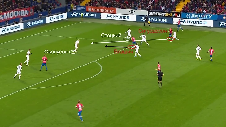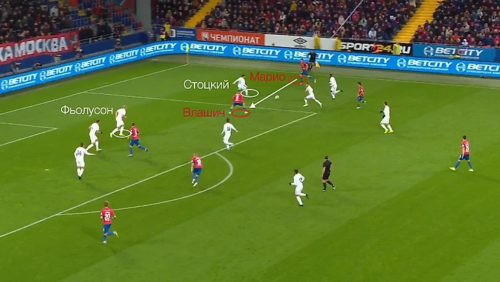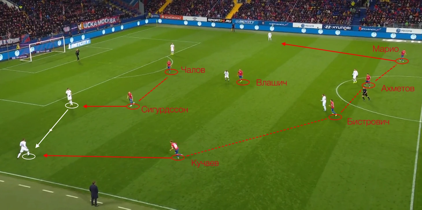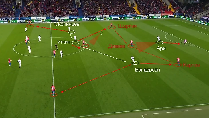 Ари работал по ЦЦЗ/Дивееву. Вандерсон и Скопинцев располагались между КЦЗ и латералями ЦСКА. Но задачи у них были разные. Если мяч переводился на ЛЦЗ/Карпова, то по нему включался Вандерсон. Если на ПЦЗ/Шарлию, то включался Уткин, используя cover-shadow против Ахметова. Скопинцев опускался к Марио.