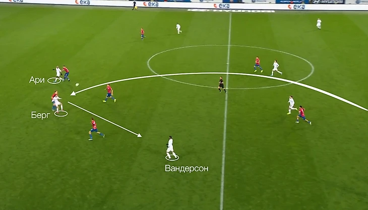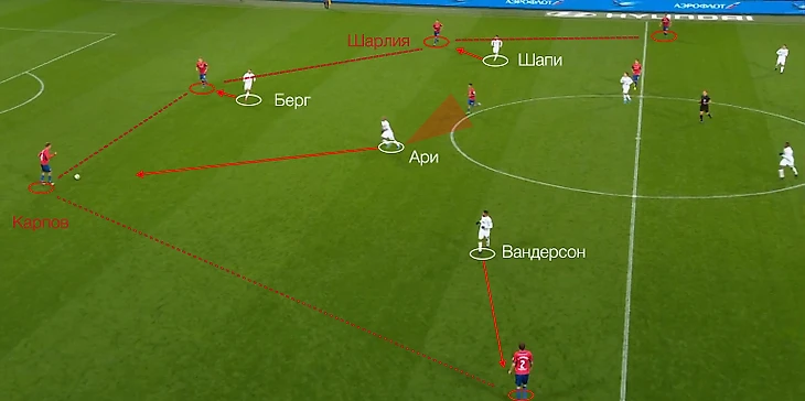 Ассиметричный прессинг сохранился. Только теперь Ари выдвигался на Карпова. Шапи действовал по Шарлии, а Вандерсон оставался с Фернандесом.