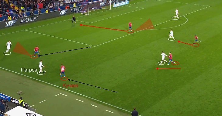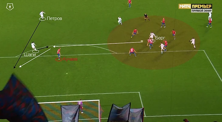 У Петрова нет вариантов для выхода из-под давления, все ближайшие адресаты перекрыты. Он делает попытку сместиться в центр и вынести мяч на Вандерсона, но попадает в Кучаева.