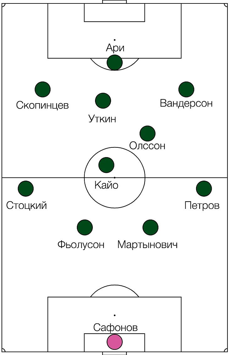 Стоцкий со Скопинцевым слишком пассивно встречали игроков ЦСКА на своём фланге. Кайо позиционно метался и пускал за спину. При включениях Фьолусона возникали риски на дальней штанге из-за перестроений Мартыновича и Петрова. Олссон не успевал читать подстраховку.