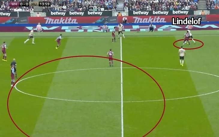 "Юнайтед" был настроен на прямолинейную доставку мяча в переднюю линию, поэтому никто из хавов не предлагал себя в центре поля, чтобы получить короткий или средний пас, развернуться и пытаться комбинировать. Узкая атакующая модель позволяла "Вест Хэму" заужать игровое пространство.