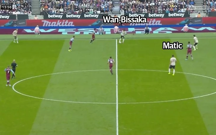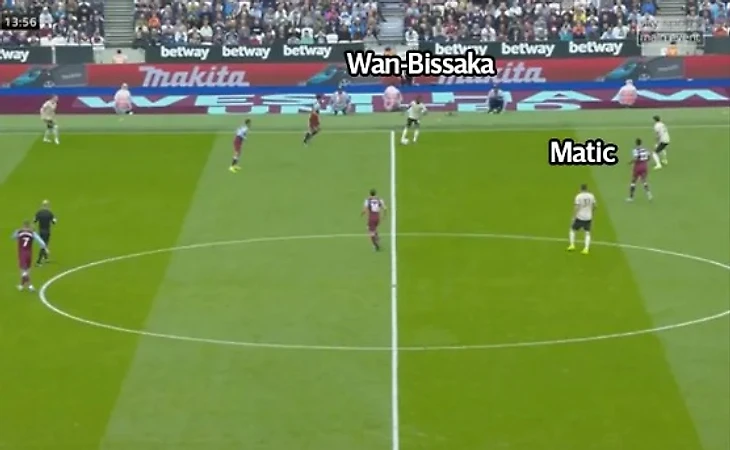 На протяжении всей встречи с "Вест Хэмом" футболисты "Юнайтед" не могли организовать качественную доставку мяча на чужую половину низом, и ни один из хавбеков не удосужился искать пространство, чтобы предложить себя партнёру с мячом. Вот здесь идёт 14-я минута. И у Уан-Биссаки нет иного выбора, кроме как отдать назад Линделёфу или коротко и поперёк Матичу.
