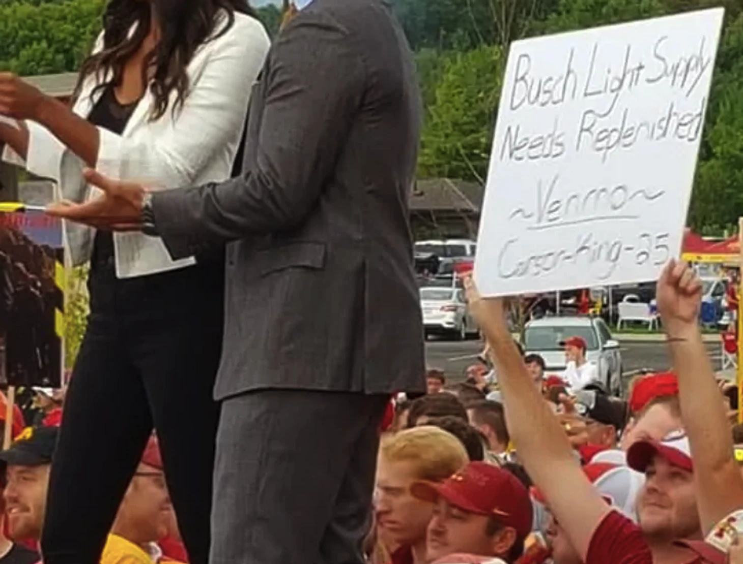 Перед матчами на канале традиционно выходит программа College GameDay – обычно ведущие занимают позицию на фоне болельщицкой толпы. На этот раз в кадр регулярно попадал фанат с плакатом, на котором вывел совсем не футбольную надпись:
