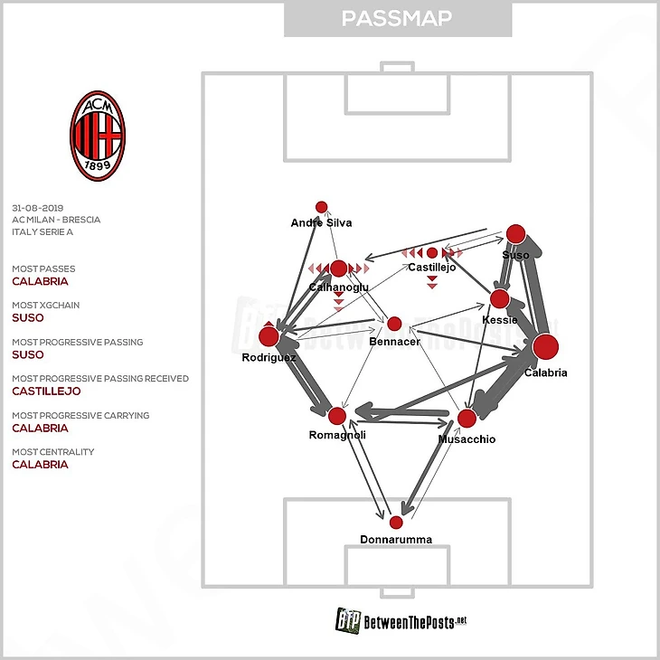 Милан-Брешиа. Главное изменение с прошлым матчем было в расположении тройки нападения, форварда, как такового на поле не было. Сусо и Силва располагались в передней линии, но оба получали мяч и открывались каждый в своем фланге, полу-фланге, Силва на левом, Сусо на правом. Кастильехо и Чалханоглу располагались в зонах 11 и 14(опорная зона соперника).