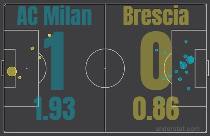 После 15 минуты игра выровнялась. Вплоть до 80 минуты, преимущество не было на стороне одной из команд. «Брешиа» немного вышла вперед по xG 0.66-0.86, но 35% времени матч проходил на трети гостей, и лишь 20% на трети россонери. Абсолютно равная игра в большой части матча против одного из аутсайдеров лиги. Не густо. Создать что-то у чужих ворот и выйти вперед по xG, Милан смог только после 80 минуты, когда «Брешиа» побежала спасаться, открыв зоны, дав возможность Милану контратаковать.