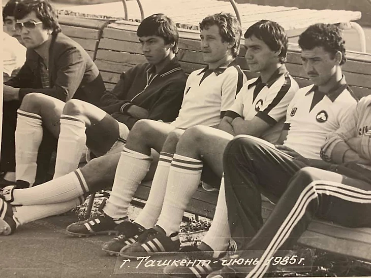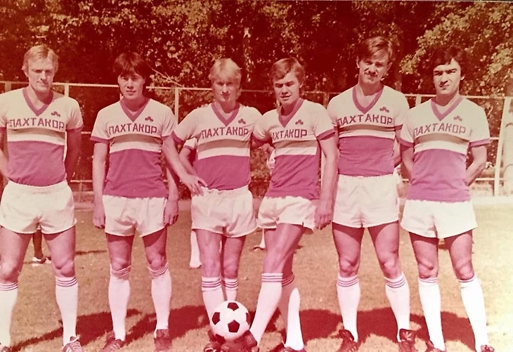 1987. «Пахтакор». Геннадий Денисов, Марат Кабаев, Василий Постнов, Олег Синелобов, Александр Кожухов и Сабирджан Разаматов (слева направо)